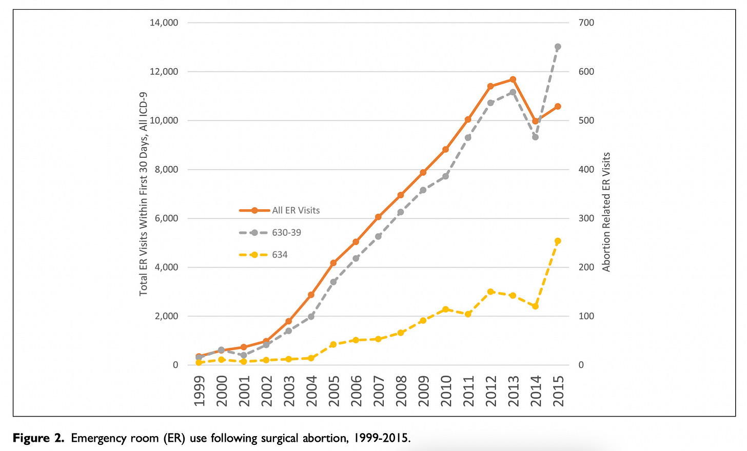 With an increase in the frequency of any medical treatment, we would expect an increase in complications. The upwardly-trending orange lines in Figures 2 and 3 do not themselves show that abortions are leading to proportionally more ER visits.